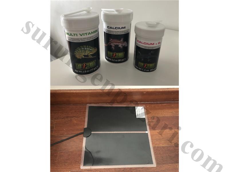 Malzemeler: 3 adet Exo terra vitamin (multivitamin, d3lü kalsiyum, d3süz kalsiyum), ısıtıcı ped